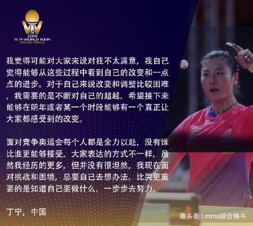 在接受国际乒乓球联合会采访时,丁宁表示,丁宁知道人们可能对她的表现不满意,但她觉得自己已经做出了一些改变和进步。丁宁说:“我需要的是不断超越自己。我希望明年或某个时候,每个人都会有真正的改变。”谈到奥运会比赛,丁宁承认她面临着困难,但她认为还有比哭更重要的事情,那就是知道自己在做什么,一步步努力。