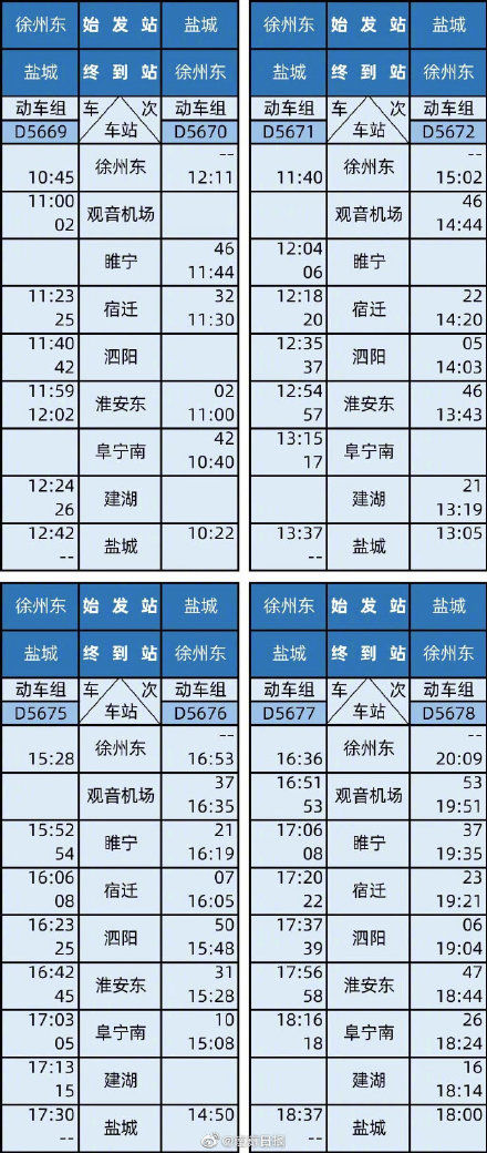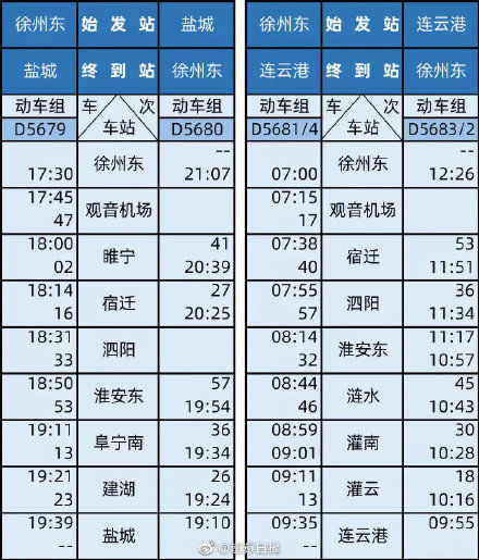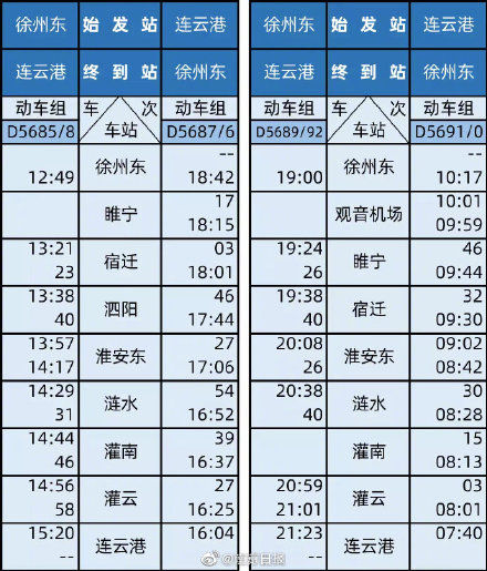 [官方公告:严旭高速铁路、廉贞高速铁路和连淮段的列车时刻表快到了!12月14日12点,徐燕高速铁路和连镇高速铁路连淮段的火车票正式发售。在运营初期(12月16日至12月29日),安排了11对动车组列车,以方便沿线人员的出行。火车时刻表就要到了,需要更改!