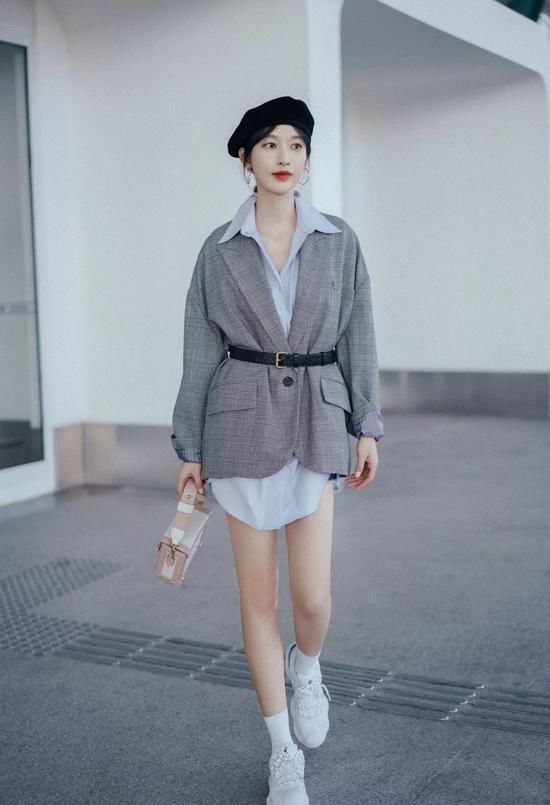 张莉的服装具有法国风格的精髓。灰色蓝色衬衫搭在方格西装上。腰带的存在不仅改善了腰线以显示出大而长的腿,而且成为与帽子相对应的唯一元素。法国人戴贝雷帽的方式,鲜红的嘴唇,大圆形耳环...似乎都在说,“我正在香榭丽舍大街上散步。”