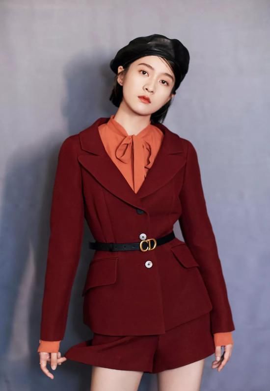 黑色皮革贝雷帽是最经典和最相配的。张薛莹的深红色套装通过帽子的装饰得到了改进。