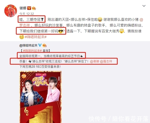 11月2日,综艺节目《嗨,唱起来》(Hi Sing Turn Up)的官方微博帖子显示,前三期获得了“连续三次收视率。谢娜也在微博上转发了这个好消息和好结果。其中,谢娜还高兴地说,该节目已经成为整个网络的电视收视冠军。她希望继续赢得冠军,并能在屏幕上感受到她的快乐和喜悦。