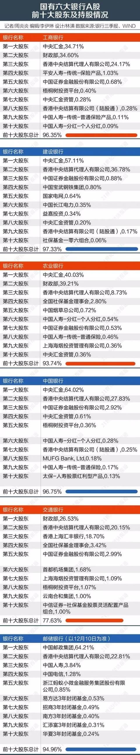六大国有行股东实力PK从股东实力来看,《21世纪经济先驱报》比较了六大国有银行a股前10名股东,发现尽管所有国有资本形成绝对控制权,但交通银行和邮政储蓄银行是股东更加多元化的两家银行。交通银行前十大股东持有77.63%的股份,邮政储蓄银行持有94.96%的股份。交通银行的股东中有外资汇丰银行,持有18.70%的股份,排名第三大股东,而中国银行,虽然第八大股东是日本三菱UFJ银行,但只持有0.18%。