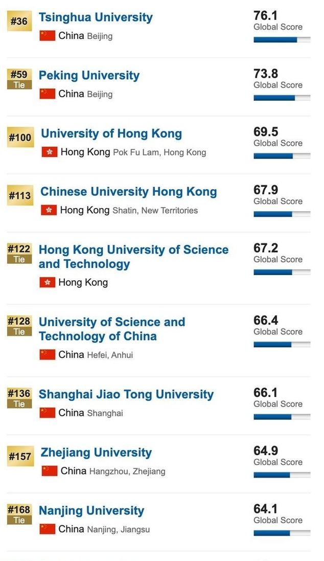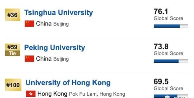 中国位列前100名,共有3所大学:清华大学(36所)、北京大学(59所)和香港大学(100所)。