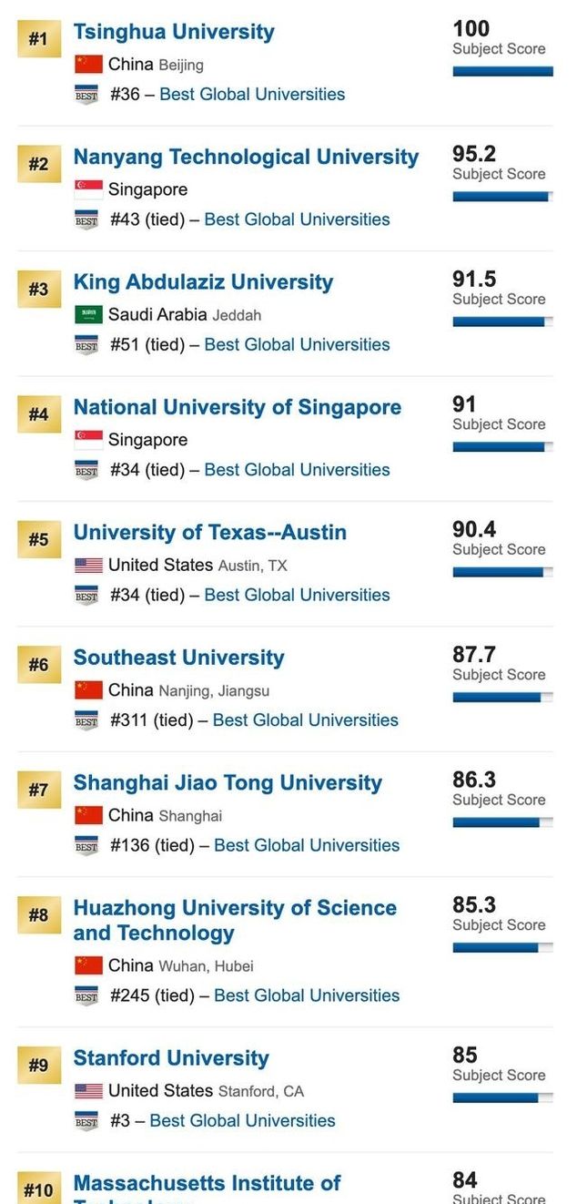 除了在计算机科学方面的突出表现,中国十大工程大学也占4。在《美国新闻》报道中特别列出的四个学科中,中国大学的表现排名前五(按顺序排列):