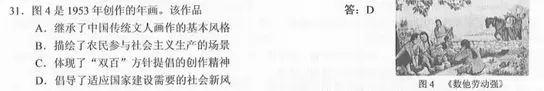 例如,文科综合国家卷三,第31题,利用“数别人努力工作”的年画设计情境来批判轻视劳动、轻视工农、强调劳动高低的传统误解。