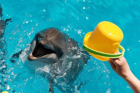 女孩在蓝色的水中玩宽吻海豚。海豚辅助治疗
