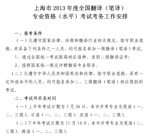 上海2013年翻译专业笔译考试考务通知