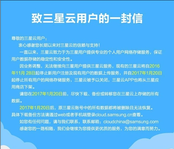 [最佳答案] 的 云用 户: 衷心感谢您长期以来 对三星云 的信赖与支持! 一 来,三星云致力于为三 星用户提供专业的个人用户网络存储服务,保证用户数据存储的稳定性和安全性。 因业务调整,无法继续向三星用户提供三星云服务,现有的三星云将自2016年11月 28日起停止新用户注册及现有用户的数据上传服务,并自2017年1月20日起停止所有用户的网络存储服务,三星云被予以关闭,三星云APP也将从三星应用商店下架。 请您在2017年1月20日前,尽快下载、备份或转移您在三星云上存储的所有数据。 2017年1月20日后,原三星云账号中的所有数据都将被删除且无法恢复。