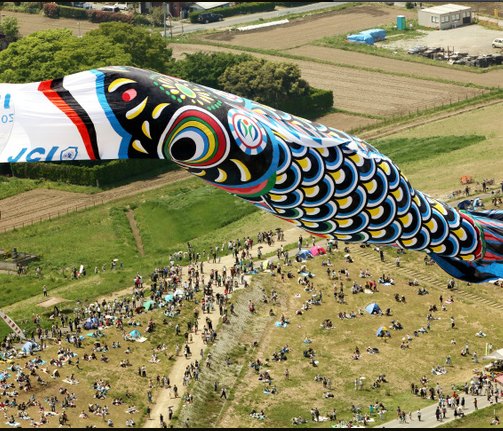 日本琦玉县升起百米长鲤鱼旗为地震灾民加油