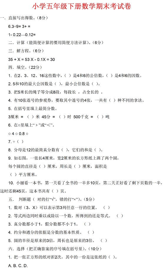 五年级数学下册期末考试经典试题教学目标:通过完善的复习,使知识系统化。共巩固所学的知识。 自主学习1、填空。(24分)(1)0.25立方米=( )立方分米 5600毫升=( )升4.3立方分米 =( )立方分米( )立方厘米 538 毫升 = ( )厘米3 30秒 = ( )分 (2)2分数单位是( ),它有( )个这样的分数单位,减去( )个这样的分数单位后是最小
