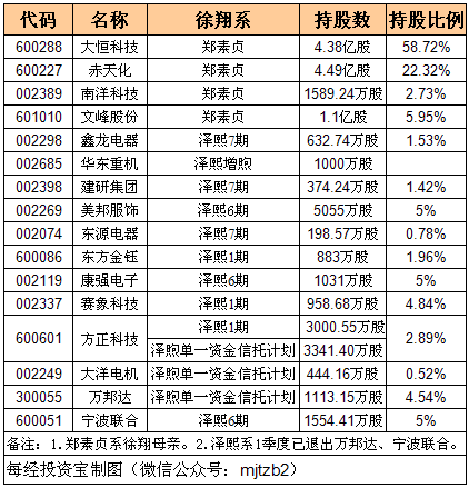 齐鲁财富网:整个徐翔家族持股大恒科技、宁波中百、东方金钰、文峰股份、华丽家族、招商南油。截至今年二季度末,郑素贞(徐翔的母亲)是大恒科