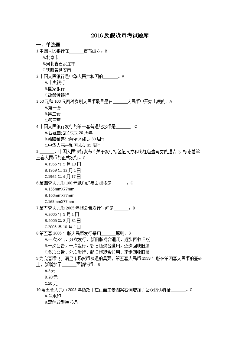 2019年反假货币考试试题题库含答案一、单选题:1.第一套人民币有_____种面额,_____种版别?CA.10, 62B.12, 60C.12, 62D.10,602.从票幅看,第五套人民币各券别的票幅宽分为_____档,票幅长则按票面大小从100元券到5元券,以_____毫米为极差递减。CA.5、3B.4、6C.3、53.《人民币鉴别仪通用技术条件》 (GB_16999-2010)中定义的A级点验