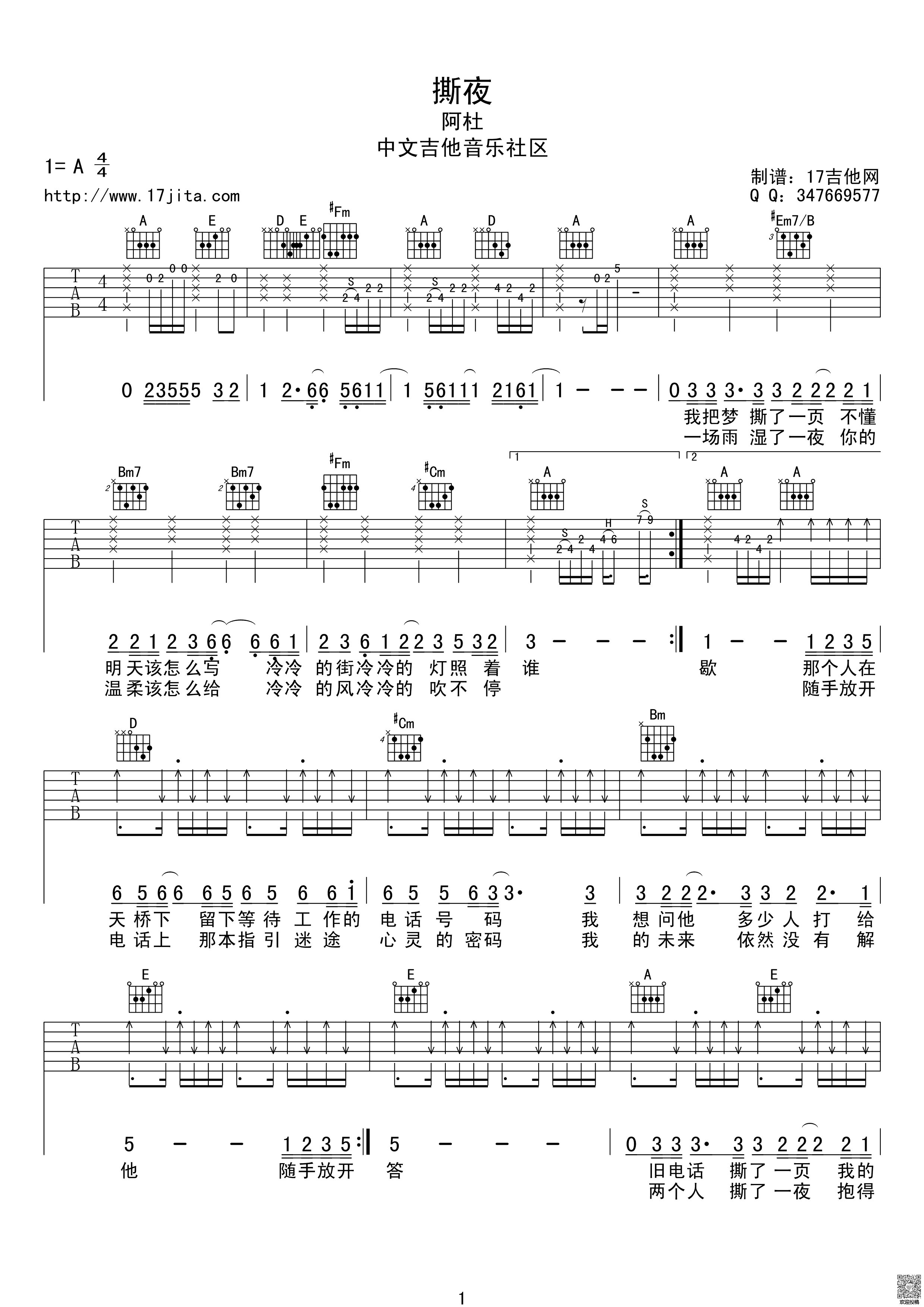 撕夜吉他谱(图片谱,弹唱)_阿杜