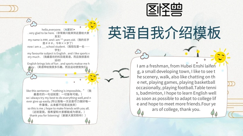 简单的英文自我介绍- 答: a member of free combat team. I am an active, bright, friendly and humorous girl. So happy to stand here and introduce myself to you. Next, I'd like to sing an English song. It