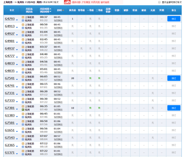 上海虹桥火车站到杭州东站时刻表(高铁)