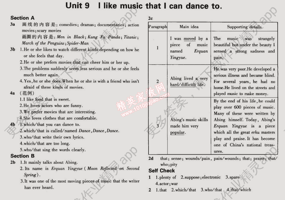 一单元SECTION A1a 我通过制作抽认卡来学习。 通过和朋友一起学习。 通过听磁带。 通过做抽认卡。 通过向老师求助。 通过读课本。 通过制作单词本。1c A:你怎么为考试而学习。B:我通过参加学习小组来学习。2a 1、你是通过看英文录像学英语的吗? 2、你曾和朋友们练习过对话吗? 3、听磁带怎么样? 4、大声