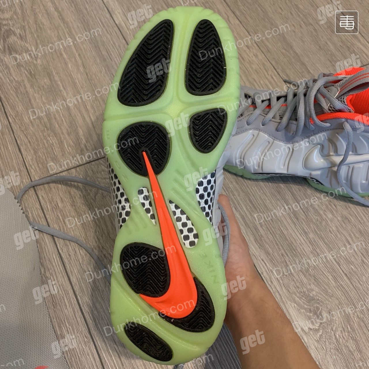 打开鞋盒灰椰子泡整体简洁,橘红色的内衬些许外漏,给人一种犹抱琵琶半遮面的感觉。 中底的黑色波点碳板,感觉充满了时尚与复古。 荧光绿的鞋底