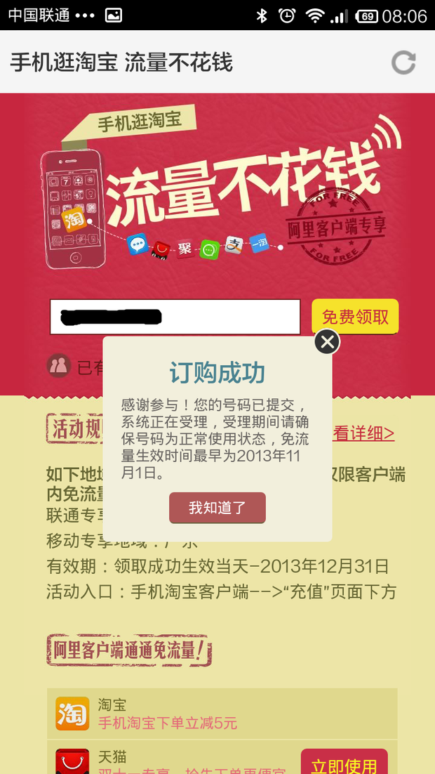 手机逛一淘\淘宝\天猫\来往 流量不花钱联通