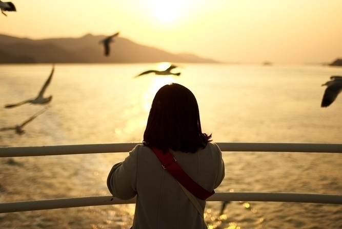夕阳下一个人看海的孤独背影