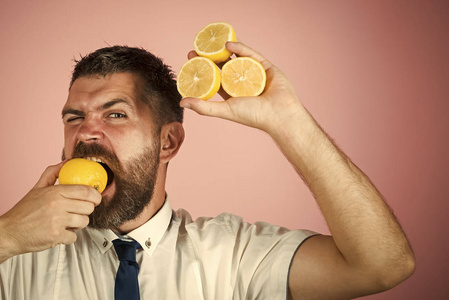 长胡子的人在粉红色的背景下吃柠檬水果