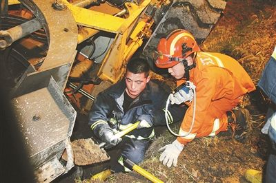 徐州10吨重推土机翻车 司机被压在驾驶室下