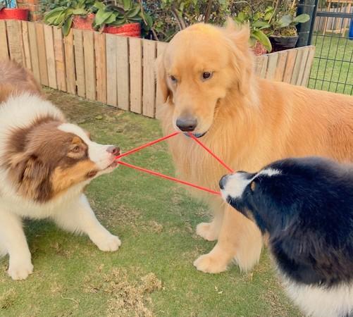 翻花绳新玩法?3只屁孩汪咬出三角阵形,