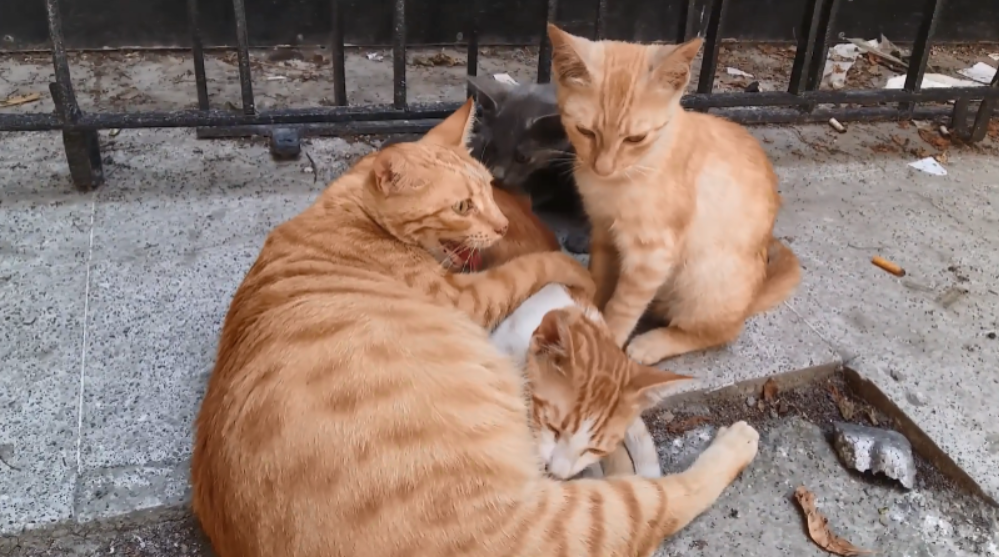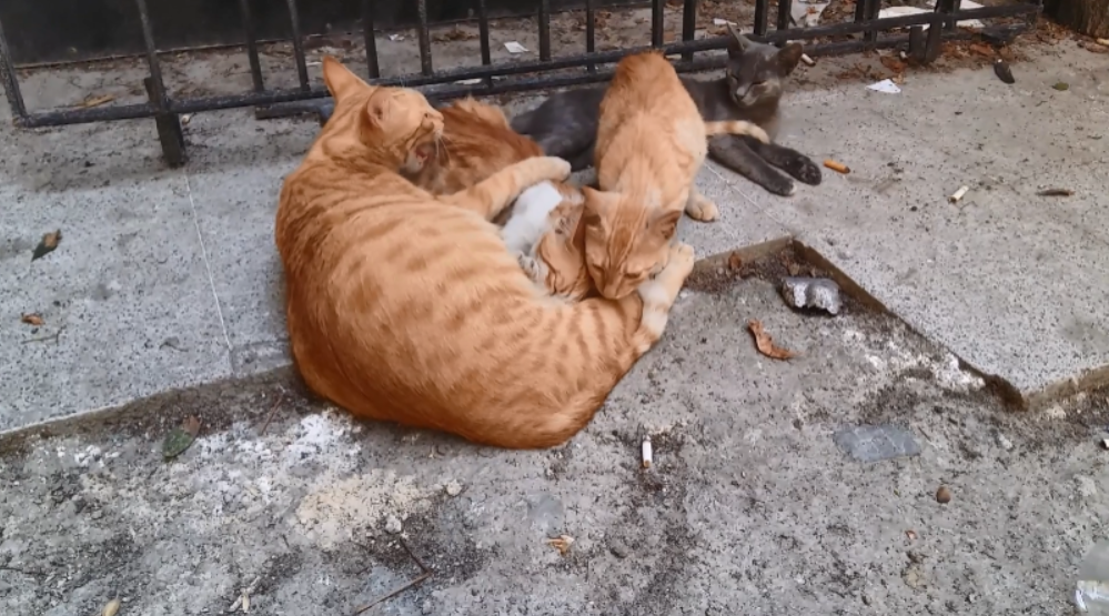 猫妈妈即将分娩,还得分心给3只小猫喂奶,生