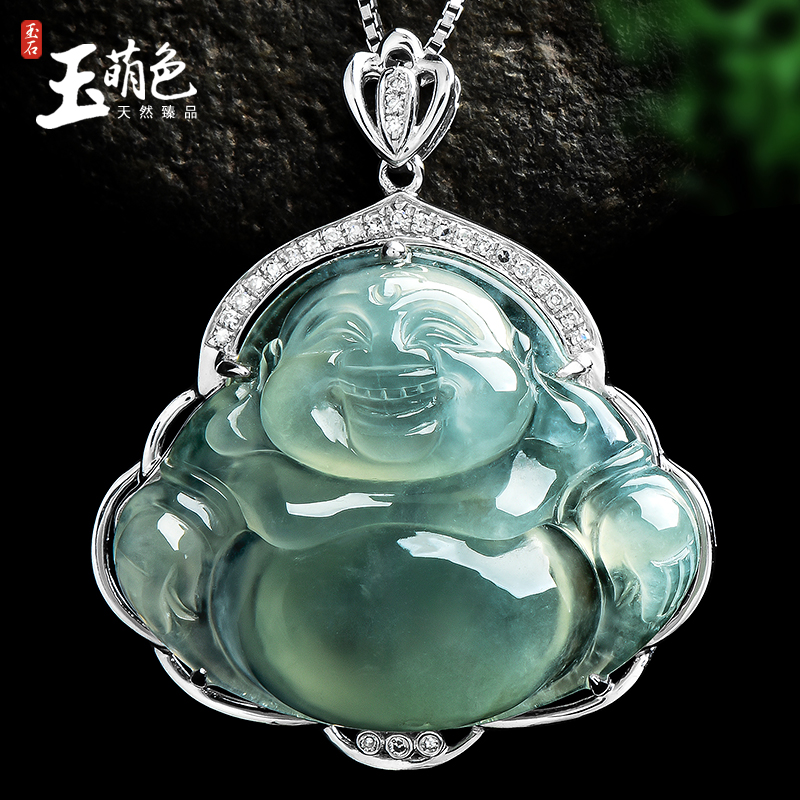 玉萌色 翡翠吊坠女笑佛挂坠冰种A货玉佛白18K金镶玉坠配钻KDZ887