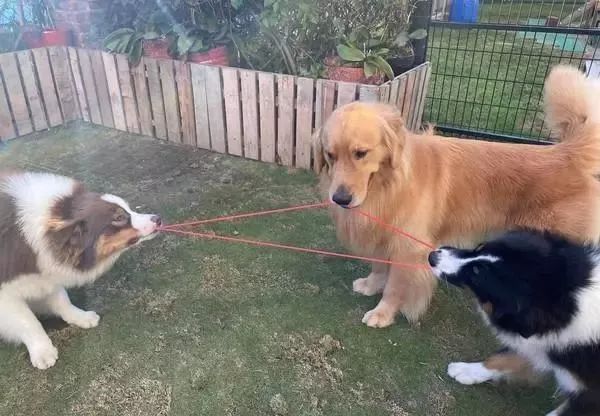 翻花绳新玩法?3只屁孩汪咬出三角阵形,