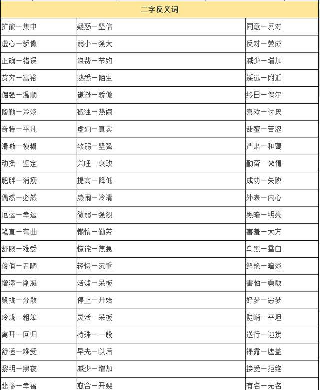 小学生都能用到的(一字、二字)反义词大全,