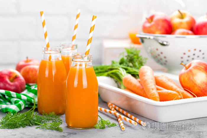 新鲜胡萝卜和苹果汁的白色背景。胡萝卜和