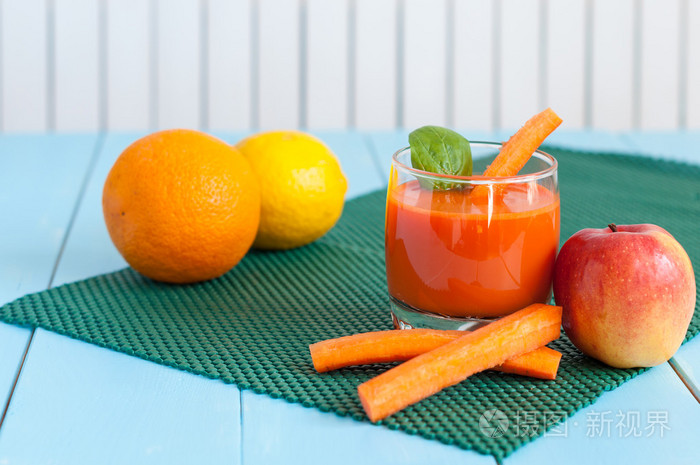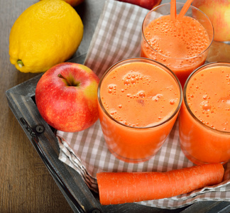 自制胡萝卜汁在玻璃和新鲜胡萝卜、 苹果