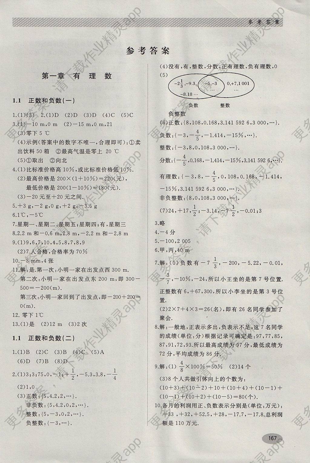 七年级上册人教版数学同步练习册参考答案