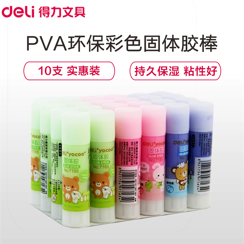 得力(deli)7165彩色固体胶棒10支可爱卡通彩色9g固体胶PVA材质固体胶棒