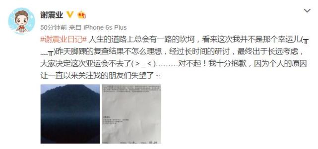 谢震业因脚踝伤势未愈无缘亚运会 中国