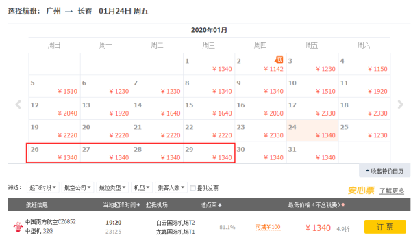 春节票!南航直飞!广州-吉林长春单程含税机票