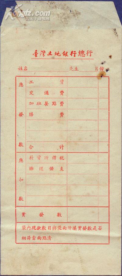 台湾土地银行总行工资袋(印政治口号)