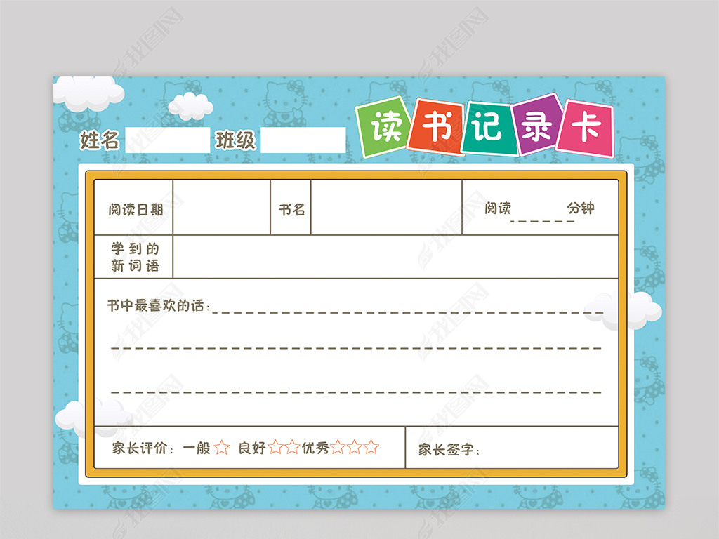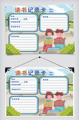 蓝色卡通读书卡学生卡通读书记录卡模板素材
