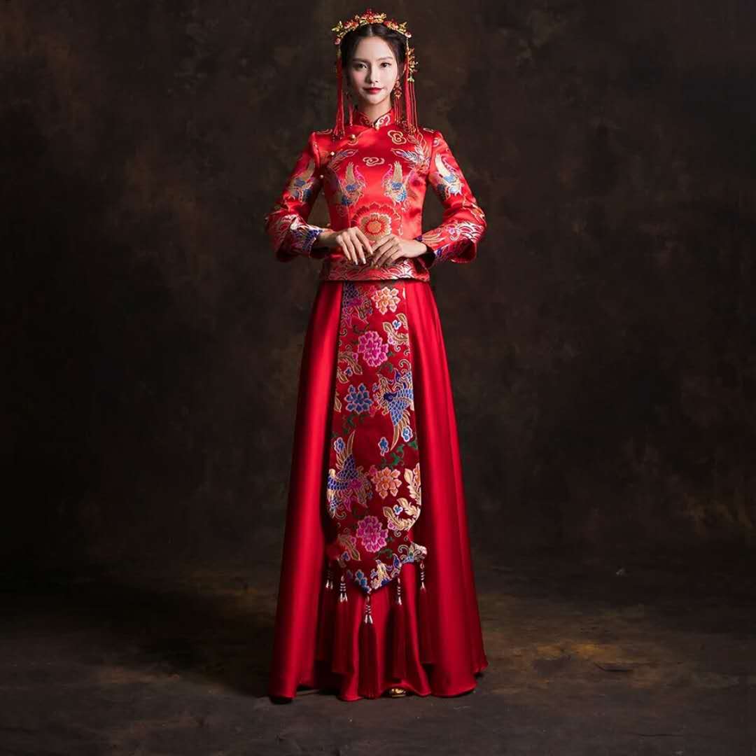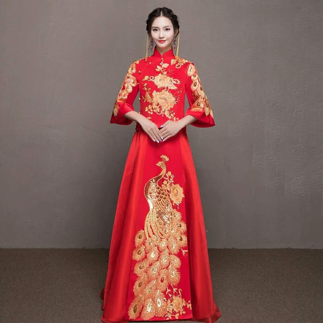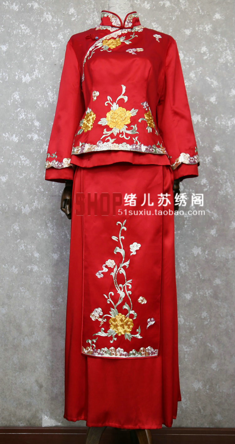 苏州长袖禾服红色敬酒服旗袍 描金牡丹 连衣裙下身纱裙新娘服