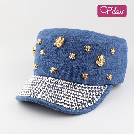 韩版闪钻牛仔休闲平顶帽子金色银色骷髅头