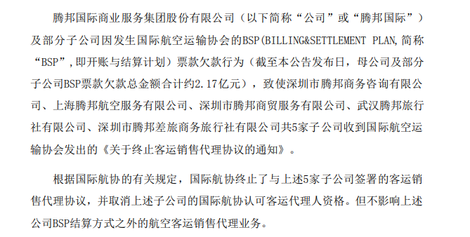 腾邦国际BSP触雷高达2.17亿元 票代业务