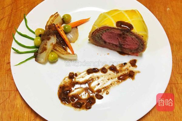 简介:这道经典华丽的牛排是英国有名的菜肴,俗称"酥皮焗牛排"。上好的菲力牛排,大火煎上色。包上一层有鹅肝酱的