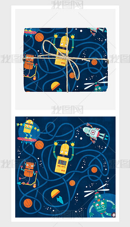 深蓝色童话风机器人迷宫趣味儿童插画动物