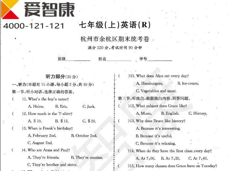 余杭区七年级上学期期末英语试卷及答案