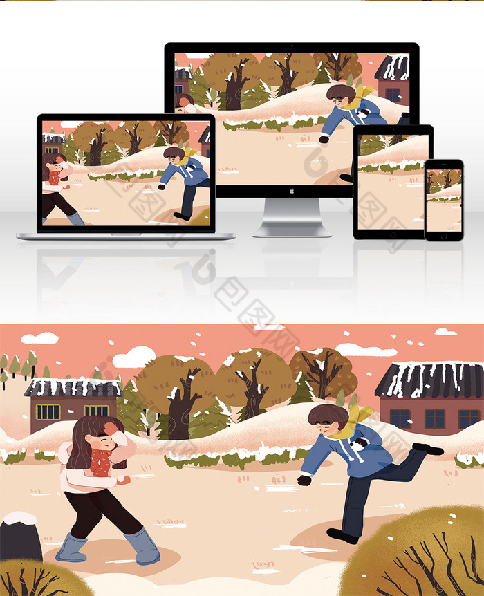 大寒节气打雪仗雪景雪花男孩女孩卡通插画