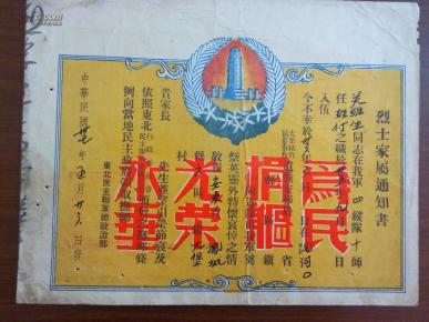 罕见烫银版民国37年5月《东北民主联军烈士证》(背带东北解放区爱国自卫战争阵亡烈士条例)-证书图册书籍相片-大众拍卖-湘泉雅集古玩交流网