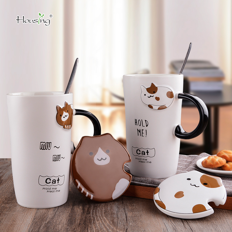 可爱陶瓷带盖勺牛奶情侣水杯 萌物驾到-