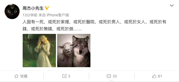 周杰发文:人固有一死或死于男人!配图充满