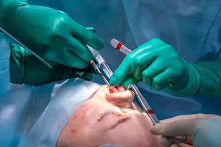 的助手执行整容手术在医院手术室的鼻子