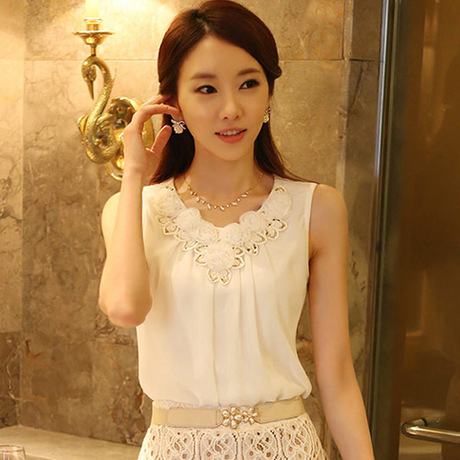 韩版女装蕾丝雪纺花朵小背心无袖雪纺衫